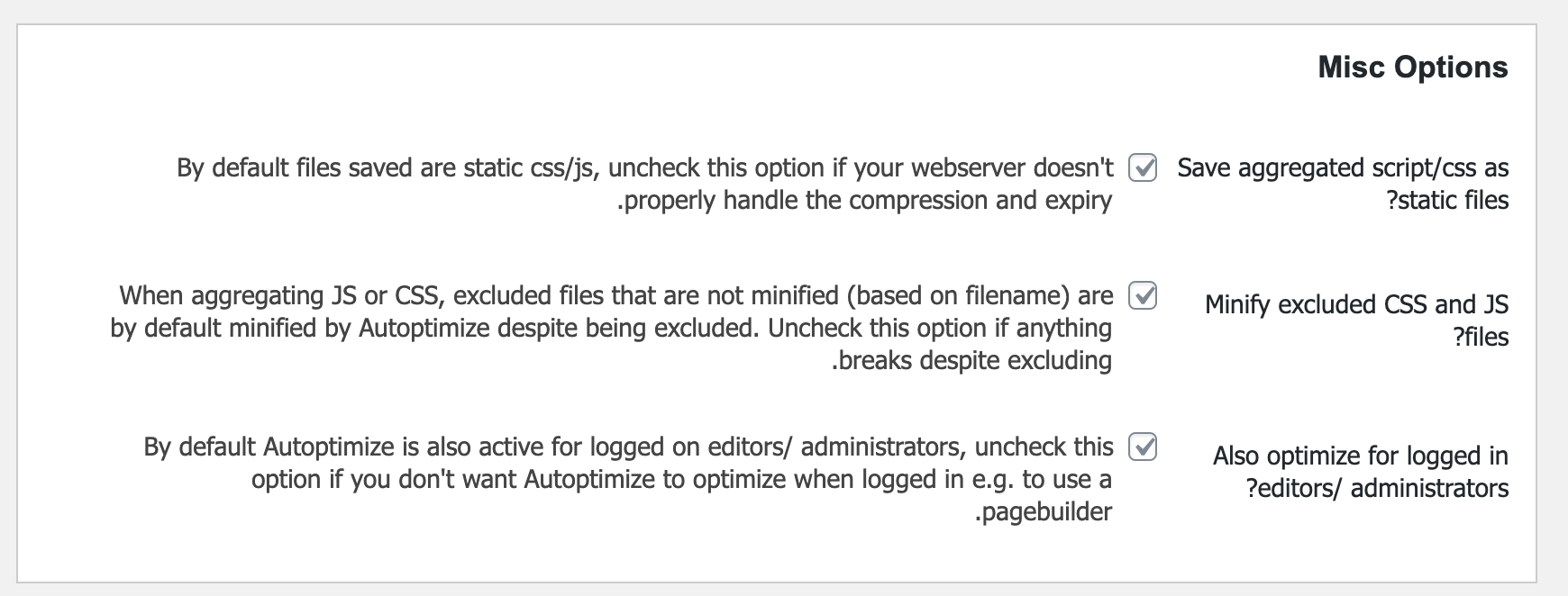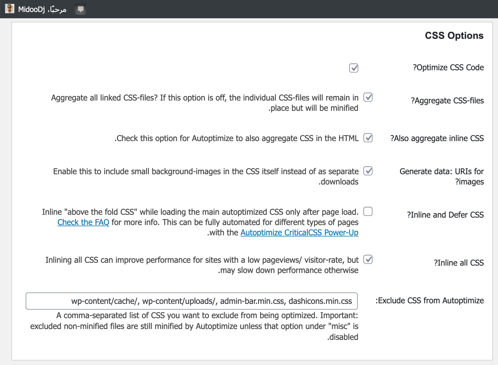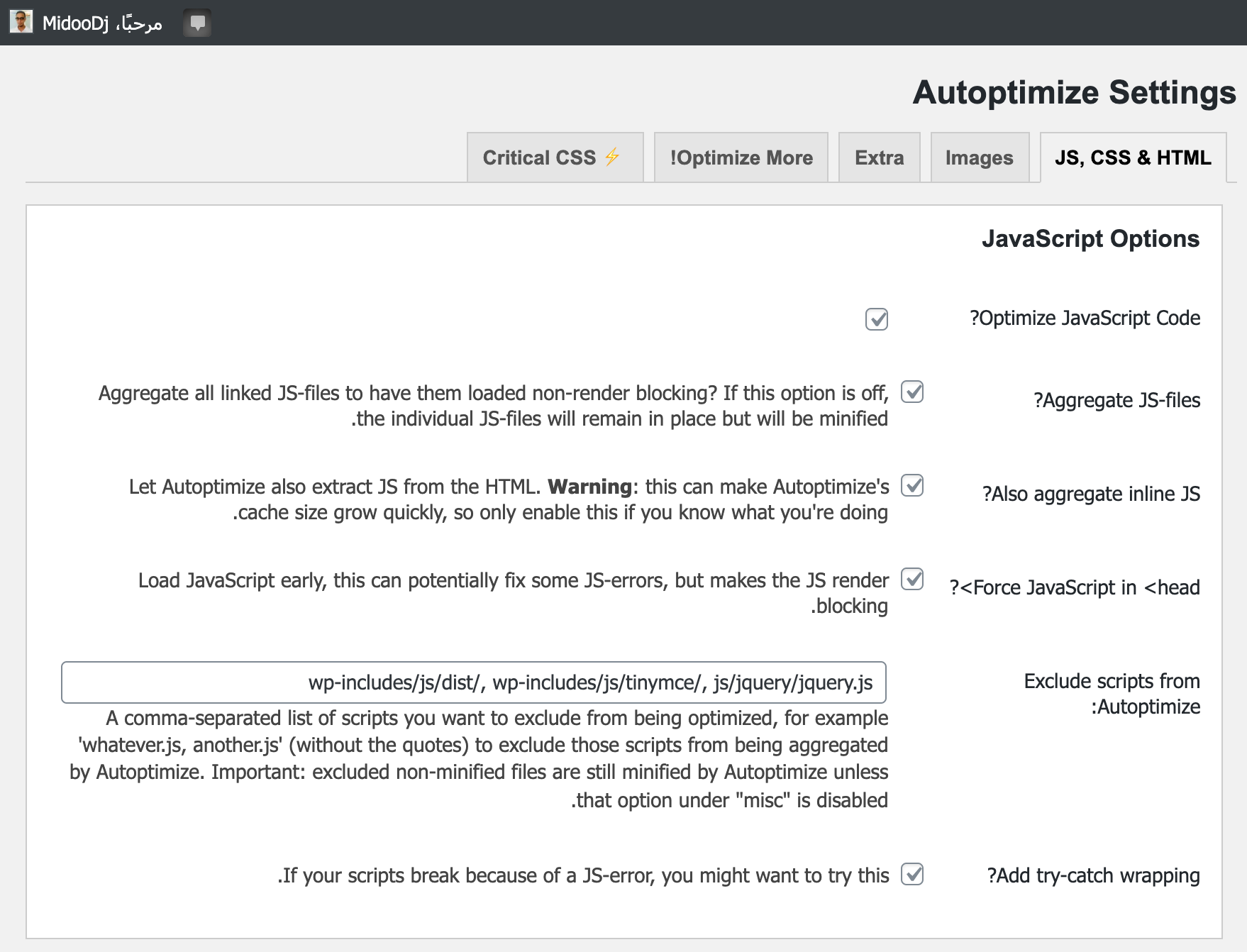 ثانيًا: قم بفتح لوحة تحكم Wordpress وأذهب إلى قائمة إضافات واختر “أضف جديد” وابحث عن تلك الإضافة: “Autoptimize” قم بالضغط على “تثبيت\تنصيب” وبعد ذلك قم بتفعيلها، وظيفة تلك الإضافة هي: Makes your site faster by optimizing CSS, JS, Images, Google fonts and more. بعد الخطوات السابقة سنقوم بالدخول على إعدادات الإضافة ونقوم بتفعيل الإعدادات كما بالصورة الموضحة: